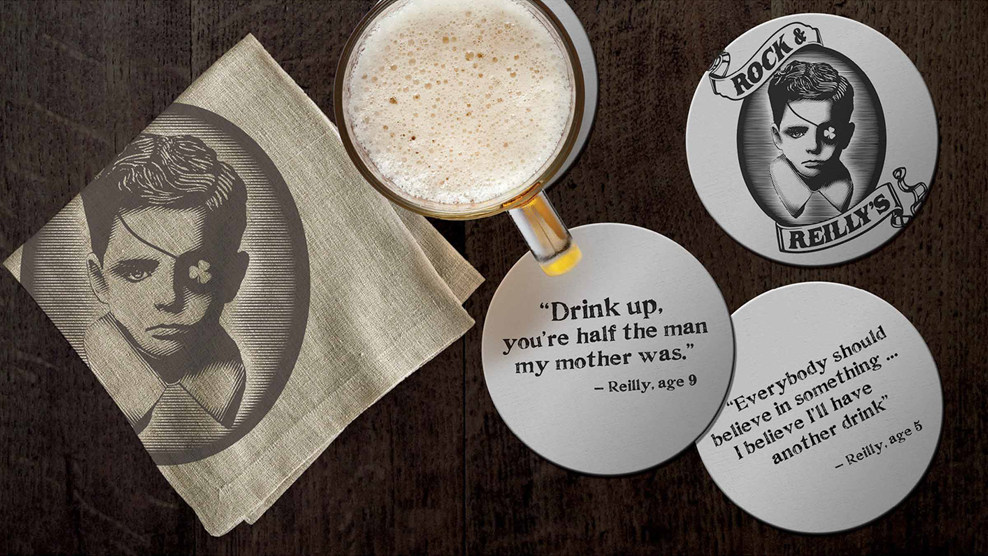 Identity, branding, and voice for an Irish rock bar on the sunset strip. The project started with illustrating the logo and took off to all phases of the location's look, in collaboration with Steve Averitt, including glasses, coasters, apparel, decor, and their own whiskey.